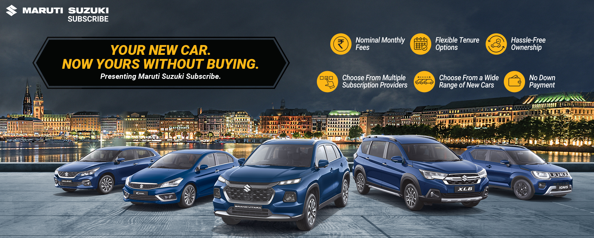 Maruti Suzuki Subscribe enables all customers to enjoy driving their preferred Maruti Suzuki cars without having to deal with all the financial responsibilities that come with owning a car.All you need to do is opt for a monthly subscription plan at a fixed monthly fee, which includes the routine maintenance and insurance costs, and choose a flexible tenure. At Reeshav Automobiles Pvt. Ltd. in, Patliputra Road, Patna, all Hatchback, Sedan, SUV, the MUV models line-up includes Baleno, Invicto, EVitara, Jimny, Ciaz, Ignis, Fronx, Grand Vitara, XL6. Here, you will enjoy Maruti Suzuki Subscribe benefits such as: